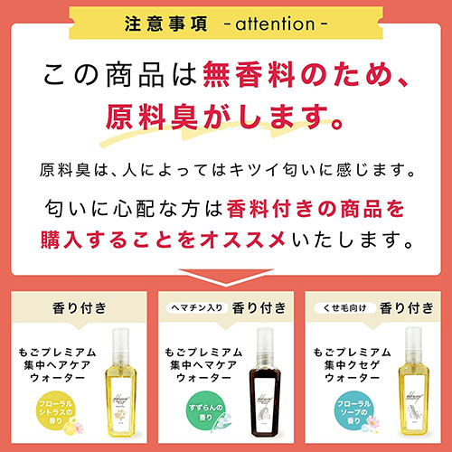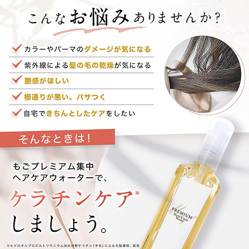 もごプレミアム集中ヘアケアウォーターは、髪の毛の主成分であるケラチンやアミノ酸を主成分にした濃色トリートメントウォーターです。