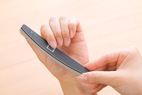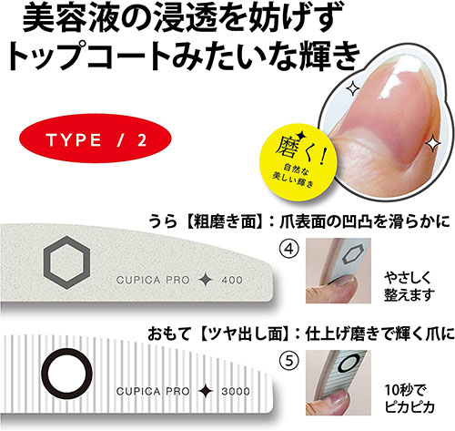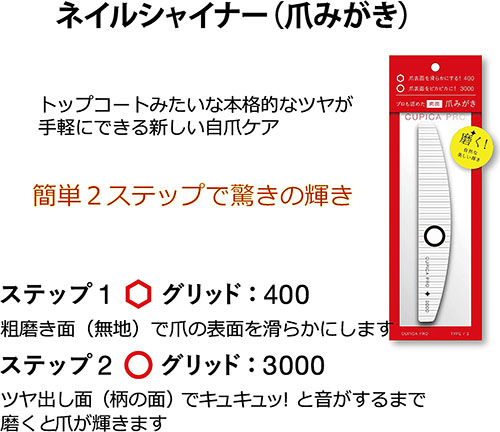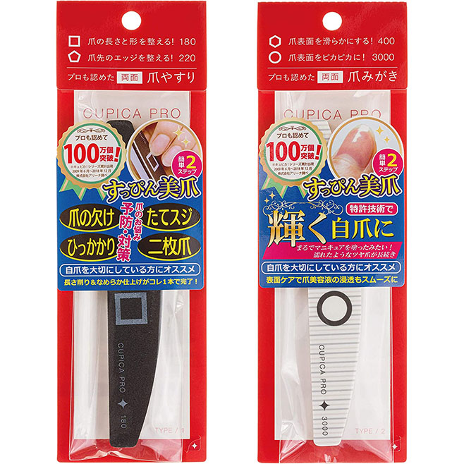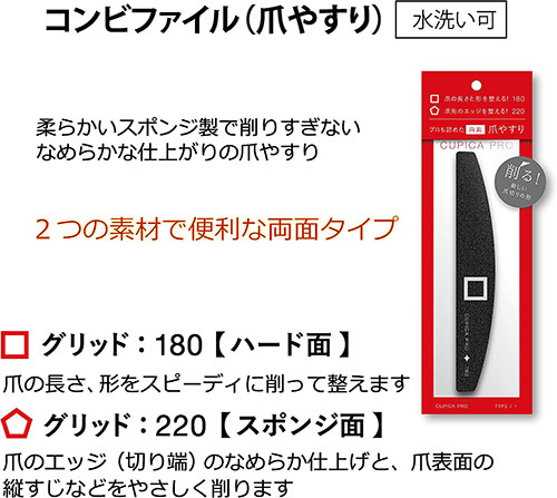 • 爪の先端を削る爪やすり【コンビファイル】と爪表面を整える爪磨き【ネイルシャイナー】のセットタイプ1・黒<コンビファイル> [180 ハード面] 爪の長さ、形をスピーディに整える、粗めのヤスリ [220 スポンジ面] 爪のエッジ(切り端)をなめらかなシルキータッチに整える柔らかいヤスリ ●ストッキングにひっかかる爪の欠け、割れや爪切り後のカドをなめらかに。 ●爪切りでは切りにくい固い爪や、割れやすい爪のトラブル予防に。 ●表面の縦すじや凸凹をなめらかに削るサンディングにも使えます。タイプ2・白<ネイルシャイナー> ●トップコートみたいな本格的なツヤが手軽にできる両面タイプの爪みがきです。 ●簡単2ステップで驚きの輝き。 [ステップ1] 粗磨き面(無地/400)で爪の表面全体を軽く磨いて爪の凸凹を滑らかに整えます。 [ステップ2] ツヤ出し面(柄の面/3000)でキュキュッと音がするまで磨くと、驚くほど爪が輝きます。 ●マニキュアが苦手で、自爪の自然なツヤを楽しみたい方におすすめ。