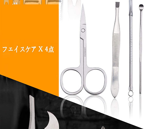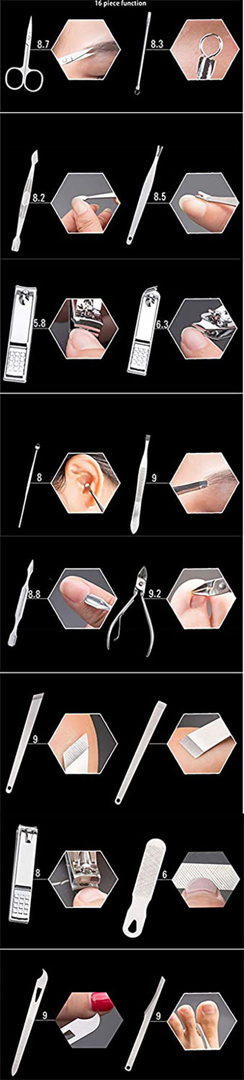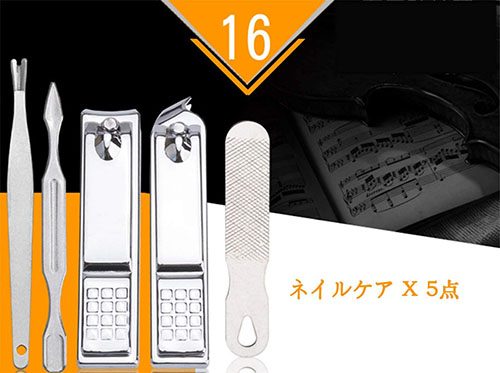 - 【16セット内容】:爪切り×3、毛抜き、ニッパー、甘皮切り、ネイルクリーナー、ヤスリ×2、甘皮取り、眉はさみ、ニキビ取り、マルチナイフ、セーフティーナイフと耳かきの便利なネイルケア16点セットです。どんな場合にも適用しています。