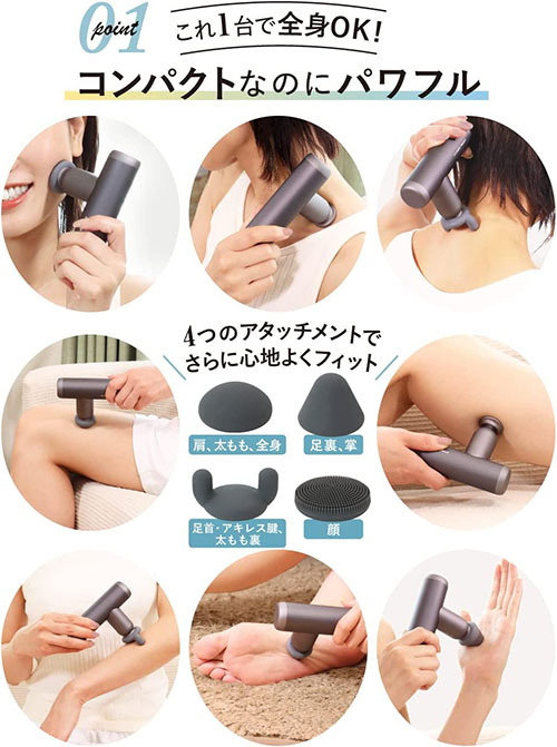 - 【これ1台で全身OK!】コンパクトなのにパワフル!4種類のアタッチメントでデリケートな顔などの部分から肩、腰、足裏などさまざまなケアしたい部位にフィット!全身ケアできます。【軽量&コンパクトで持ち運びに便利!】本体重量255gと超軽量、しかも手のひらサイズ!専用収納ポーチ付きでどこにでも持ち運べます。テレビやスマホを見ながら、オフィスやリモートワークのちょっとした空き時間に、フィットネスの合間に使用シーンも選びません。