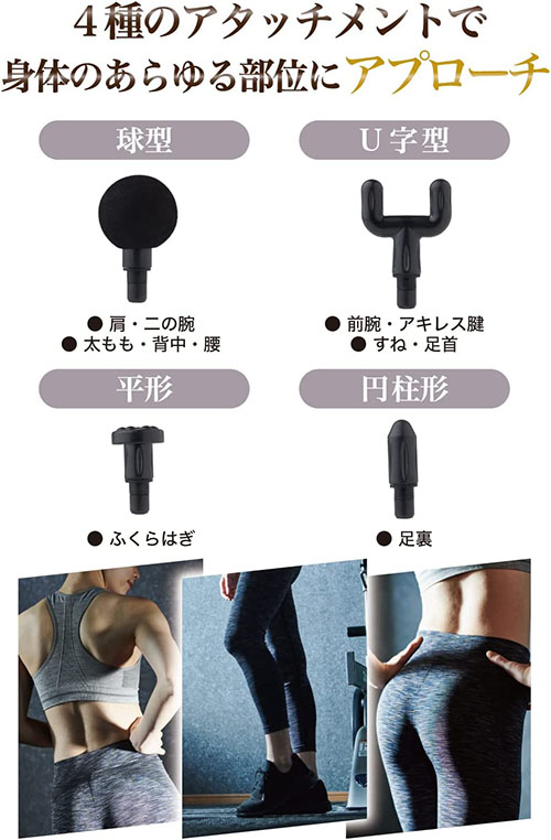 - 【プロレベルのボディケアを自宅で】[4種のアタッチメント] ボディケアのプロが選びぬいた4つのアタッチメントを付属。『球型』:肩・二の腕、太もも・背中・腰などの大きめの筋肉に 『U字型』:前腕・アキレス腱、すね・足首などの細めの筋肉に 『平型』:ふくらはぎなどあらゆる部位に 『円柱型』:足裏などピンポイントな部位に リリースボディミニはあらゆる部位に使えるアタッチメントを搭載。