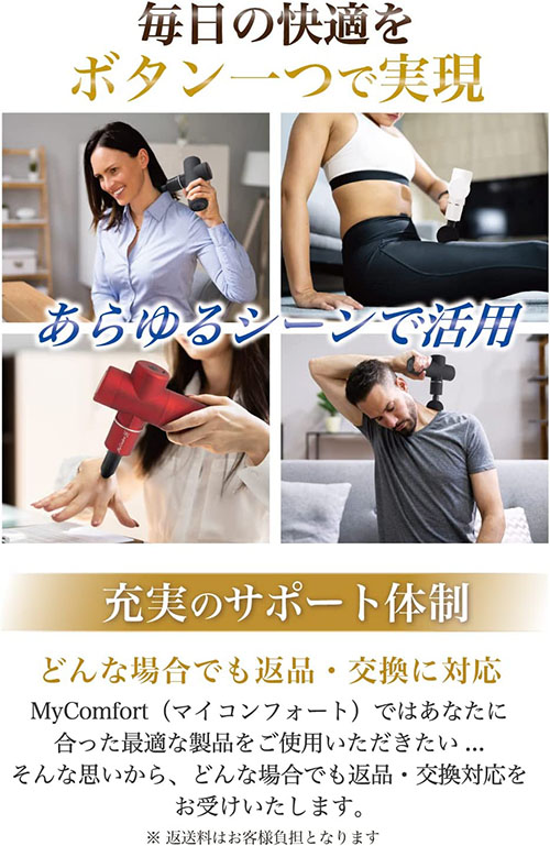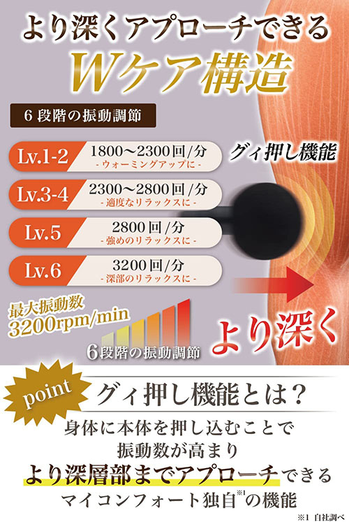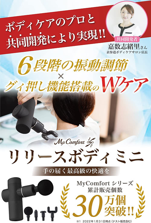 - 【トータルボディケア】ボディケアのプロと共同開発により実現したMyComfort(マイコンフォート)のリリースボディミニ。マイコンフォート独自の”グィ押し機能”を搭載したWケアモデル。1分間になんと最大3200回転のパワフルな振動数。