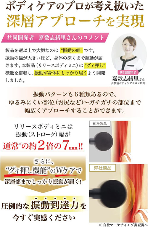 - 【こだわり抜いた機能性】[6段階の振動調節] 使い分けられる6つの振動レベルを搭載。 [グィ押し機能] ボディケアのプロと共同開発により実現した機能の一つが「グィ押し機能」。本体を押し付けることで振動レベルが上がり、しっかり振動を届けます。[軽量設計] 本体の重量はわずか380g。振動レベルが増すと重さも感じやすくなりますが、軽量設計だから男性・女性問わずお使い頂けます。